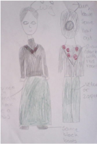 So in the first design she is wearing a dress with a black top and green hem. She’ll wear a flowery black shawl and have her hair in a messy grey bun. She’ll wear black shoes (the same as Mr Kranky’s for practical reasons) that will not show underneath the dress. In the second design I added in a collar and designed a Velcro zipper system should it be needed. I added the collar because I realised that Mr Kranky will be wearing a collar top, so it has to be concealed. I made a third design after I looked in the costume room and saw a knitted vest with a floral design that I thought would be great. However, then I decided on design two because I liked it better and a shawl is easier to get off than a vest.